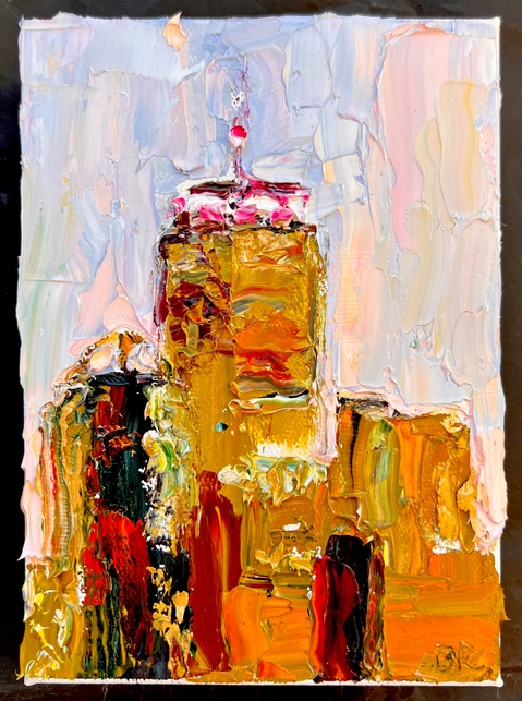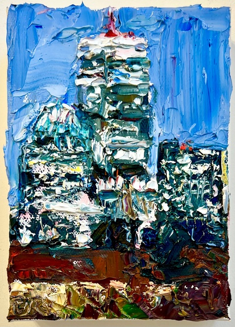In Beverly Rippel’s diaristic series of exquisite jewel-like paintings measuring just 7” x 5” x 1.5”, Boston’s 2nd largest building, “The Pru”, emerges from her thickly impastoed surfaces of simmering florets of intense pigment and elegantly ridged smears of paint.